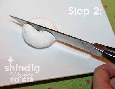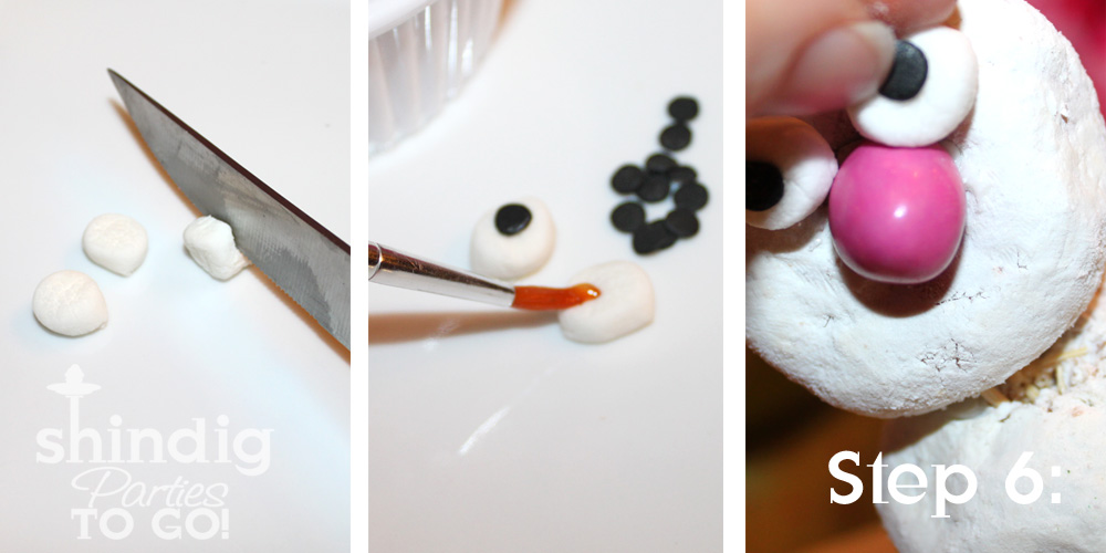 Step 6: Cut a small white marshmallow in half for the eyes. Next, add a little Karo syrup to your marshmallow with a paintbrush and adhere a round black sprinkle to the center for an eyeball. If you can't find round black sprinkles (I get mine around Halloween at Walmart), just use a black edible marker to make a pupil or you could just use chocolate chips for the eyes. Now add a little white frosting the back of your marshmallow and place it on your bunny face above the nose. Repeat for the other eye.